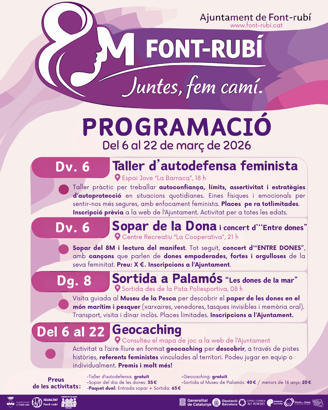 Taller d’autodefensa feminista, Sopar de la Dona amb concert d'Entre dones", sortida cultural a Palamós per descobrir el paper de les dones en el món marítim i un geocaching feminista obert a tota la ciutadania formen part d’una programació pensada per reivindicar la igualtat des d’una mirada col·lectiva i transformadora.